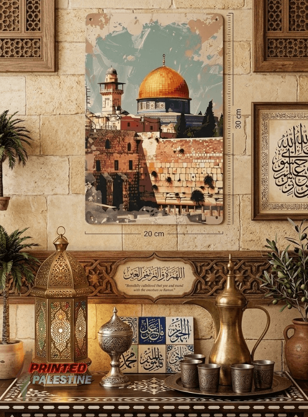 De afbeelding ademt historisch besef, Palestijns rijke erfgoed en diepgaande symboliek. Perfect voor wie een betekenisvol accent wil toevoegen aan de woonkamer, keuken of werkruimte – overal waar vrijheid en kracht centraal staan.